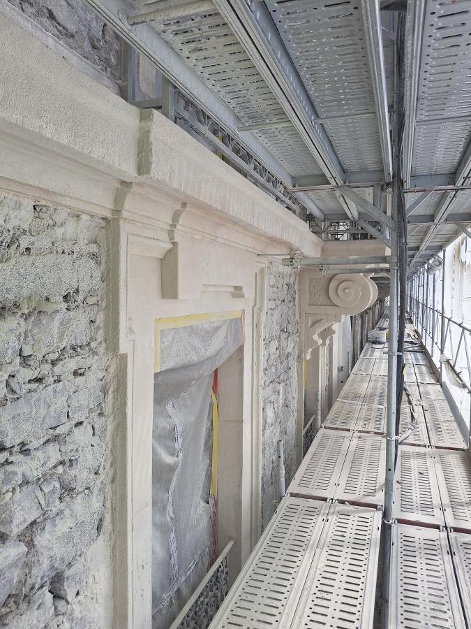 Chantier patrimonial en cours - préparation des façades en vue de leur crépissage.